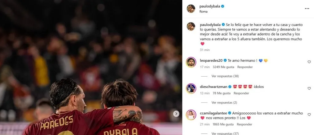 La Joya, compañero de Paredes en la Selección Argentina y hasta hace poco, en la Roma, le dedicó un posteo en Instagram. “Se lo feliz que te hace volver a tu casa y cuanto lo querías. ¡Siempre te vamos a estar alentando y deseando lo mejor desde acá! Te voy a extrañar adentro de la cancha y los vamos a extrañar a los 5 afuera también. Los queremos mucho”, expresó en un collage de fotos juntos y con sus respectivas parejas.