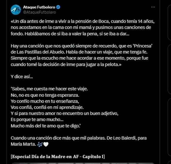 “Un día antes de irme a vivir a la pensión de Boca, cuando tenía 14 años, nos acostamos en la cama con mi mamá y pusimos unas canciones de fondo. Hablábamos de si iba a valer la pena, si se iba a dar“, recordó el ex Boca en diálogo con Ataque Futbolero, en el marco de un especial por el Día de la Madre.