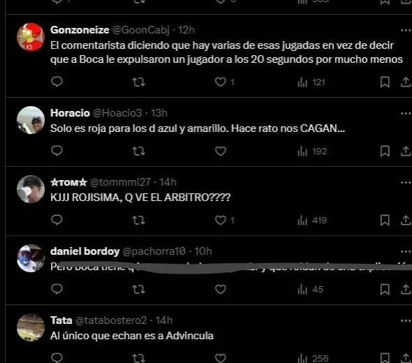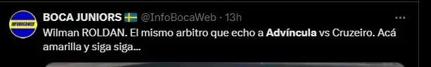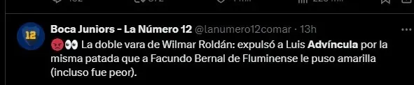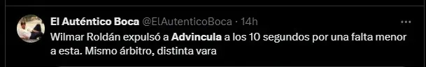 Inmediatamente, la patada del jugador de Fluminense al hombre de Atlético Mineiro recordó lo que fue la jugada de Advíncula ante Cruzeiro. Y, teniendo en cuenta que se trató del mismo árbitro, estos reaccionaron:”Solo es roja para los de azul y amarillo”, “Al único que echan es a Advincula”, y “Este tipo es el que dirigió Cruzeiro-Boca?”.