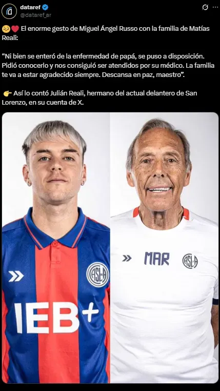 Pero hay un futbolista a quien ayudó especialmente durante su paso por San Lorenzo. Se trata de Matías Reali, quien se sumó al Ciclón a mitad del 2024 y poco después coincidió con Miguelo allí. Su hermano Julián contó un hecho hasta ahora desconocido sobre Russo para con él.