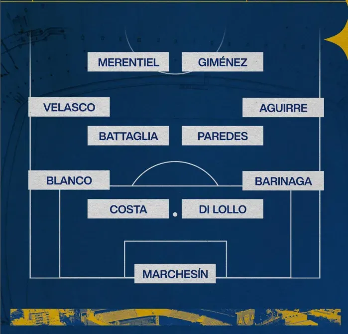 De esta forma, Boca saldrá con: Agustín Marchesín; Juan Barinaga, Lautaro Di Lollo, Ayrton Costa, Lautaro Blanco; Brian Aguirre, Leandro Paredes, Rodrigo Battaglia, Alan Velasco; Miguel Merentiel, Milton Giménez.