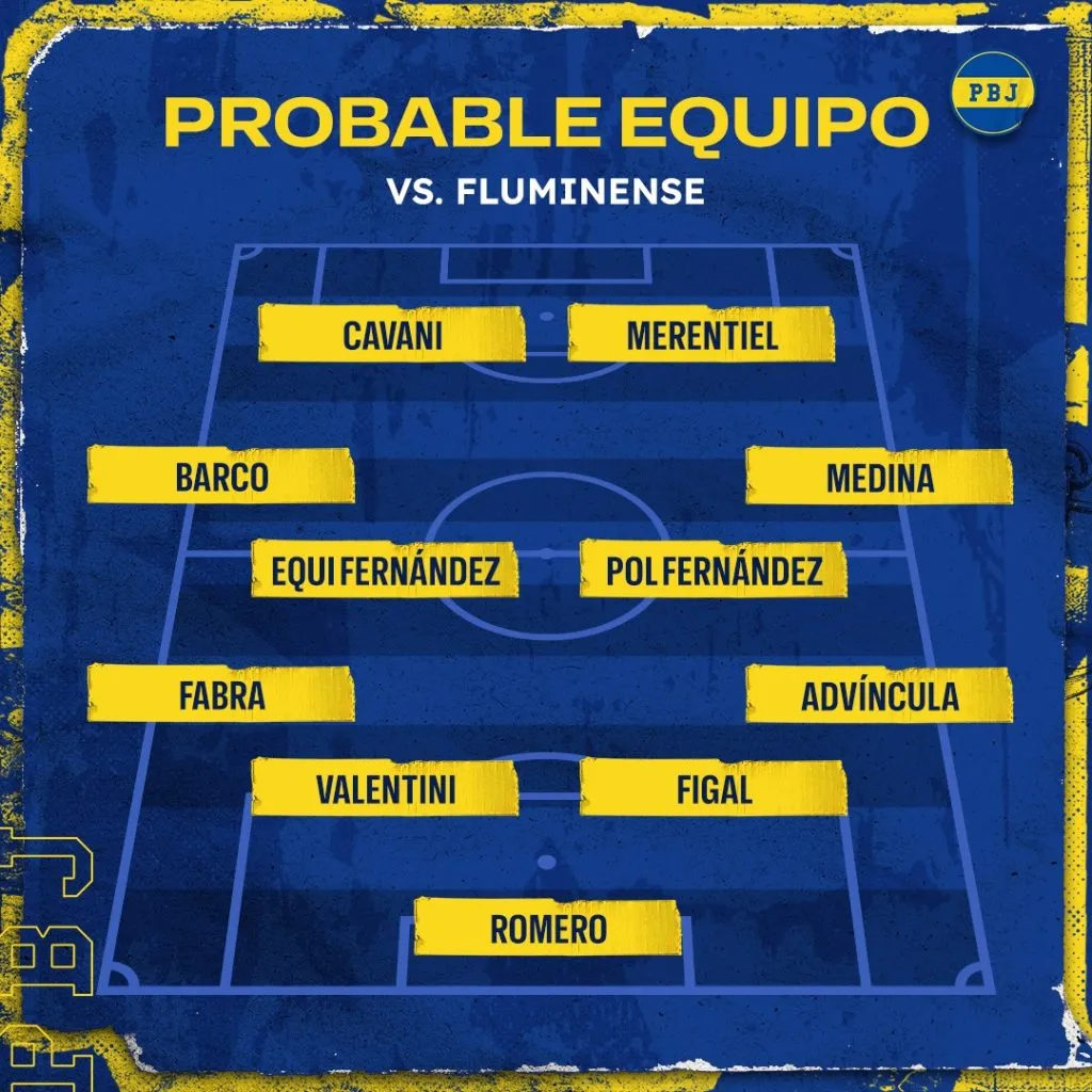 El equipo que probó Jorge Almirón en la práctica matutina: Sergio Romero; Luis Advíncula, Nicolás Figal, Nicolás Valentini, Frank Fabra; Cristian Medina, Guillermo Fernández, Ezequiel Fernández, Valentín Barco; Miguel Merentiel y Edinson Cavani.