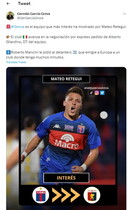 Según contó el periodista Germán García Grova, Genoa de Italia es el equipo que más interés ha mostrado por Mateo Retegui. “El club italiano avanza en la negociación por expreso pedido de Alberto Gilardino, DT del equipo. Roberto Mancini le pidió al delantero que emigre a Europa a un club donde tenga muchos minutos”, reveló.