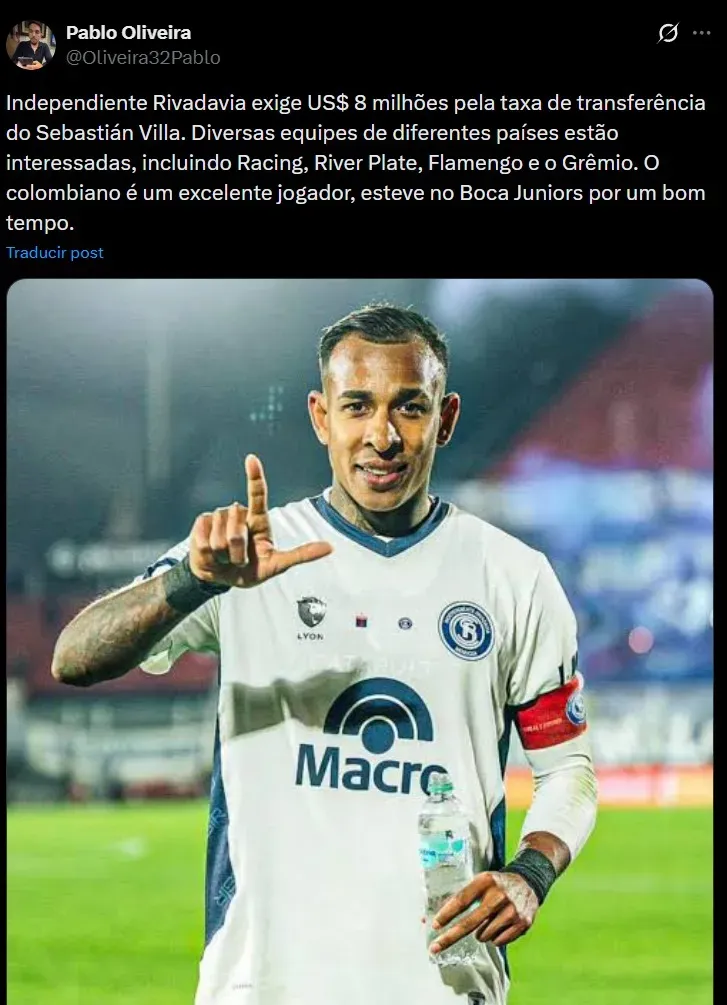 En Brasil se habla de varios clubes en torno a Villa, que hace poco anunció su salida de Independiente Rivadavia de Mendoza, donde fue campeón de la Copa Argentina. Gremio también lo sigue y fue vinculado a River y Racing.