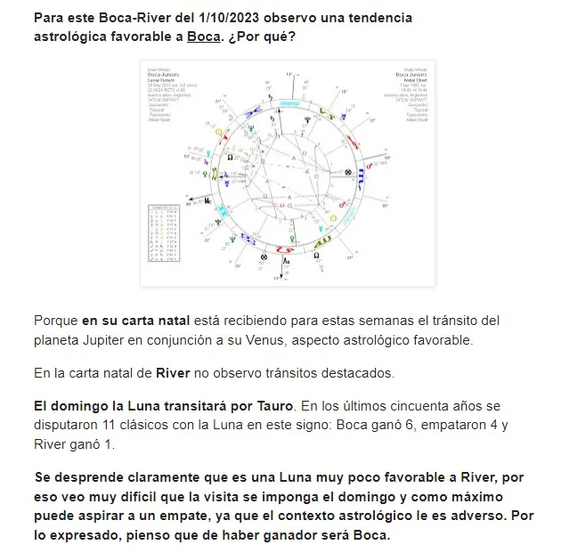 El astrólogo Juan Cruz Sirius, o también conocido en Twitter con su usuario “Astrología con rigurosidad” se animó a dar su pronóstico para el partido en Brandsen 805 e indicó una tendencia favorable a Boca. Luego dio su argumento: “En su carta natal está recibiendo para estas semanas el tránsito del planeta Jupiter en conjunción a su Venus, aspecto astrológico favorable. En la carta natal de River no observo tránsitos destacados”.
