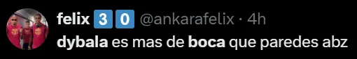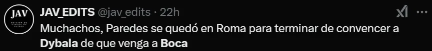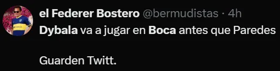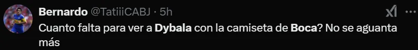 “¿Cuánto falta para ver a Dybala con la camiseta de Boca? No se aguanta más“, escribió en X (Twitter) un simpatizante. Otro se animó a anticipar que el cordobés arribará al cuadro azul y oro antes que el propio Paredes. “Dybala va a jugar en Boca antes que Paredes. Guarden tuit“. Otro usuario escribió que el atacante cordobés es incluso más fanático de Boca que Paredes: “Dybala es más de Boca que Paredes, abrazo”.