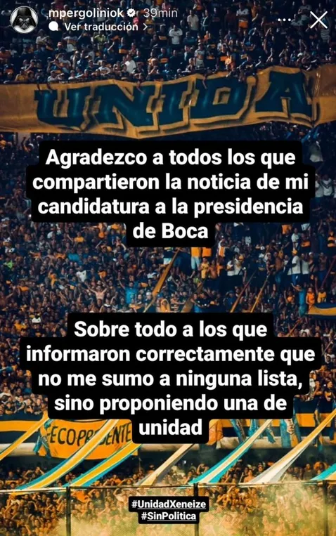 Mario se presentaría a través del movimiento llamado ‘Unidad Xeneize’ donde, según reconoció el conductor radial “hay gente del oficialismo, Y será metiéndome un poco más en la política, que creo que fue donde pequé la vez pasada”. Además, llamó a la unidad: “Creo que hay que juntarse, unirse, lograr cosas por el club que todos creemos que deberían hacerse”.