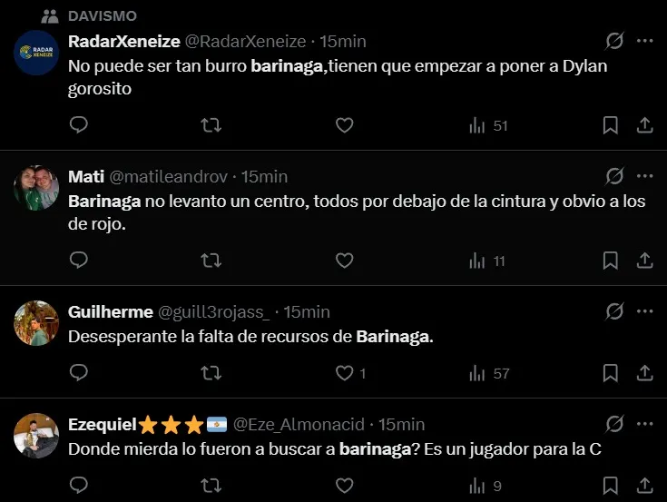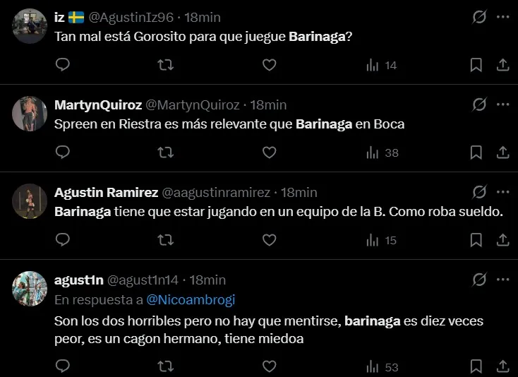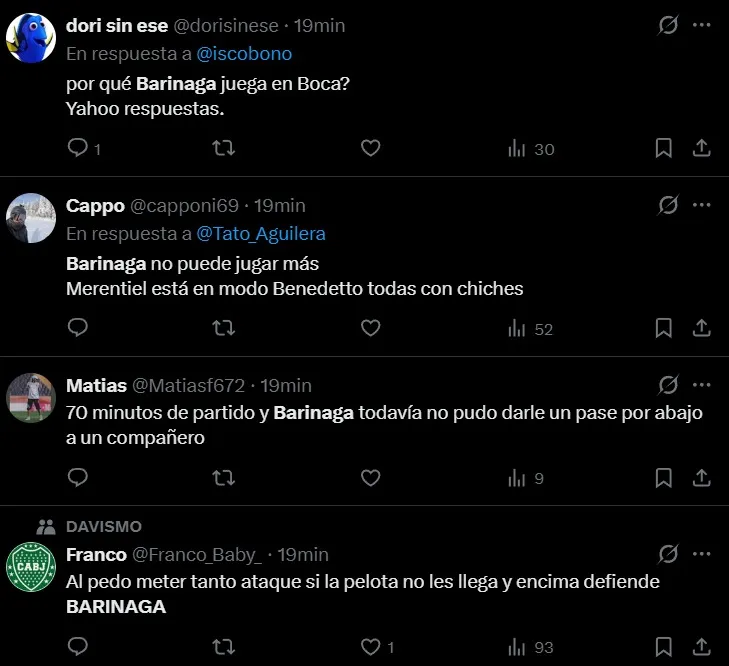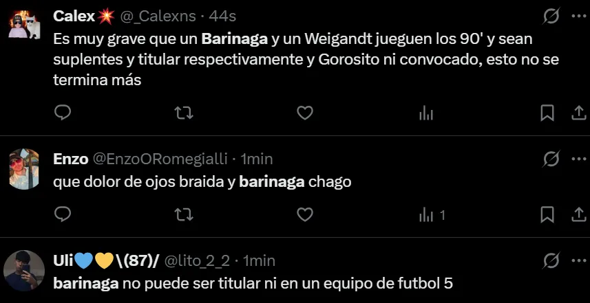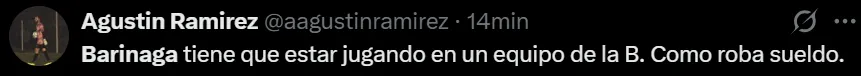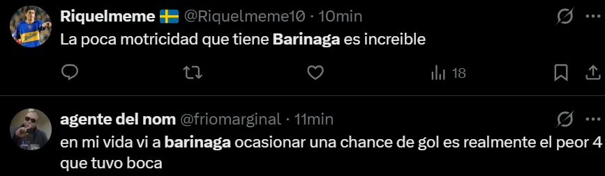 Uno de los jugadores más apuntados por los hinchas fue Juan Barinaga. El lateral fue titular en lugar de Marcelo Weigandt y su actuación no fue buena, desatando muchas críticas en las redes sociales. “Desesperante la falta de recursos de Barinaga”, “No levantó un centro, todos por debajo de la cintura”, “¿Por qué Barinaga juega en Boca?”, fueron algunos de los comentarios.