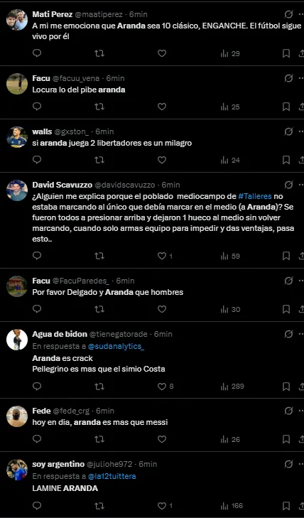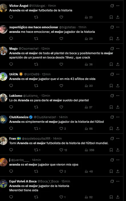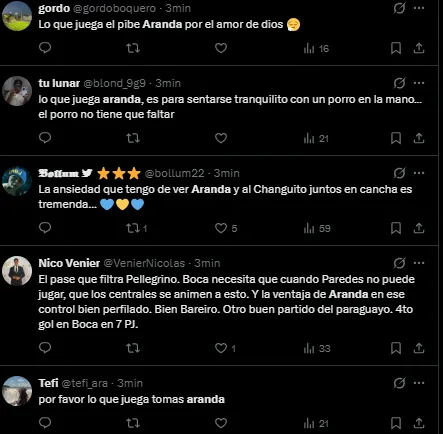 “Lo que juega Aranda“, “Tengo debilidad por Aranda“, “Es muy bueno“, “Locura del pibe Aranda“, fueron algunos de los comentarios de los usuarios bosteros de X (Twitter).