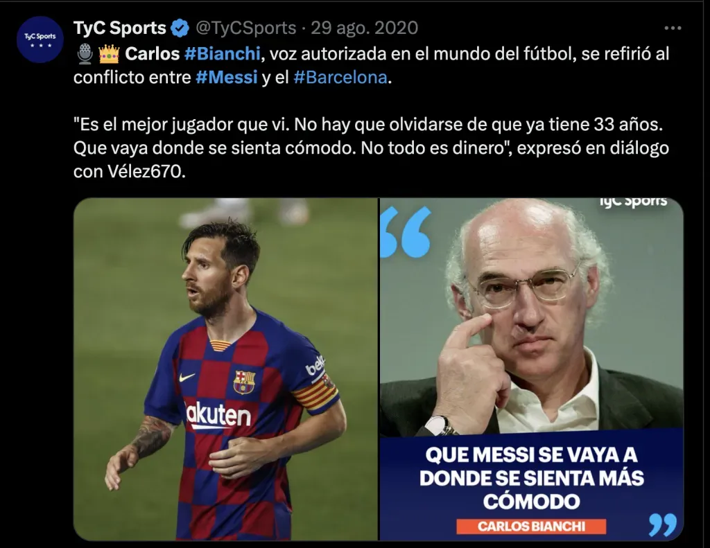En reiteradas ocasiones Carlos Bianchi dejó en claro que, para él, Lionel Messi es el mejor jugador de todos los tiempos. Por encima de nombres como Diego Maradona, Pelé, Cruyff y Alfredo Di Stéfano.