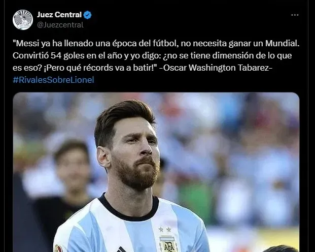 Por último, en 2018, Tabárez nombró una vez más al campeón del mundo en Qatar 2022. Y con el diario argentino La Nación, afirmó: “Ya ha llenado una época del fútbol», considerándolo como el mejor del mundo y afirmando que «no necesita ganar un Mundial. Convirtió 54 goles en el año y yo digo: ¿no se tiene dimensión de lo que es eso? ¡Pero qué récords va a batir! A mí no me tenía que dar prueba, pero no me afilio a los que dicen que le falta tal o cual cosa para ser un consagrado”.
