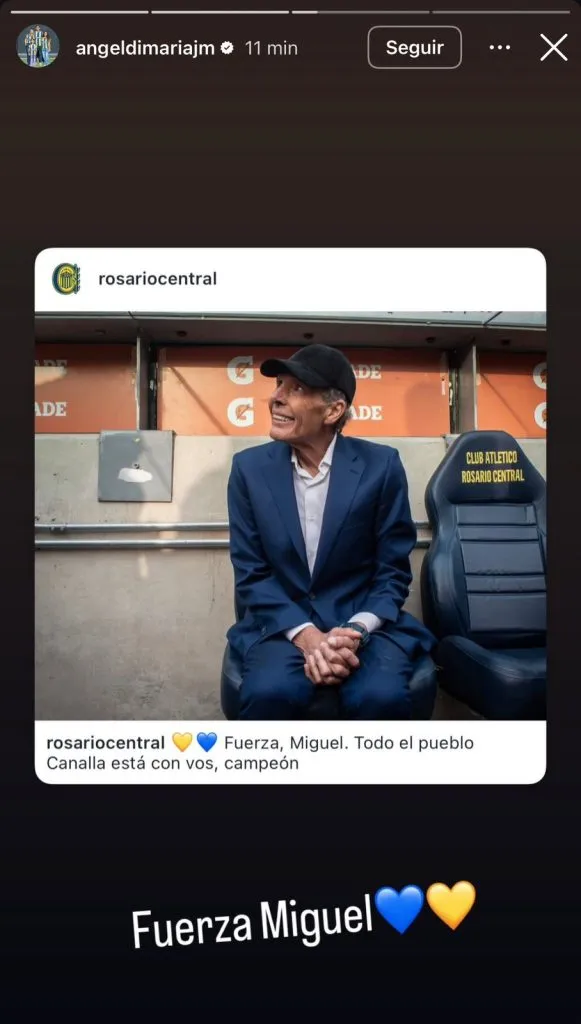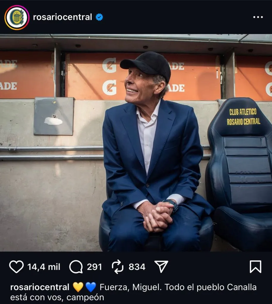 El campeón del mundo y actual jugador de Rosario Central, donde Russo es ídolo, subió una historia con un corto, pero sentido mensaje: “Fuerza Miguel”. Acompañando el texto, está el saludo del conjunto Canalla al entrenador, que también posteó en redes su apoyo. A su vez, “Fideo” no fue el único jugador que se expresó sobre la salud de Miguelo. Jorge Broun, golero del elenco rosarino, habló sobre el delicado momento de Russo.