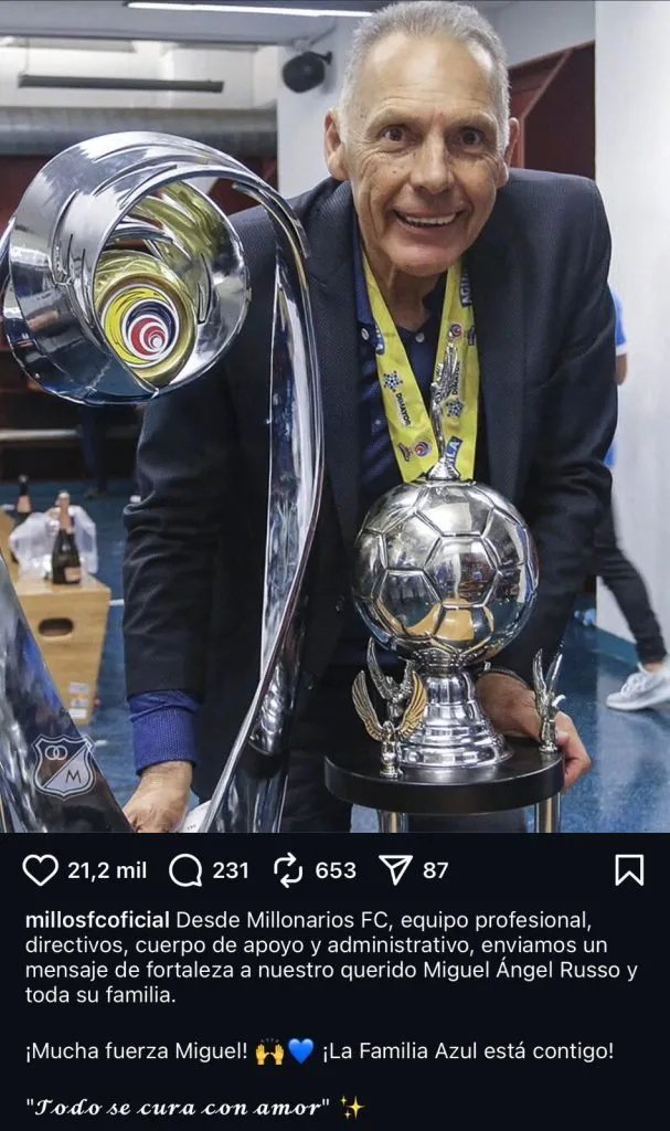 Millonarios de Colombia, club donde es ídolo y campeón, le dejó otro sentido mensaje: “Desde Millonarios FC, equipo profesional, directivos, cuerpo de apoyo y administrativo, enviamos un mensaje de fortaleza a nuestro querido Miguel Ángel Russo y toda su familia. ¡Mucha fuerza Miguel! ¡La Familia Azul está contigo!”.