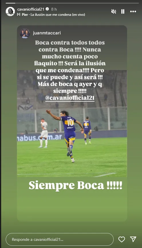 En la mañana de este jueves, el capitán del equipo subió una historia reposteando los dichos de un amigo suyo. “Boca contra todos, todos contra Boca. Nunca mucho cuesta poco. Será la ilusión que me condena, pero sí se puede y así será. Más de Boca que ayer y que siempre. Siempre Boca“, anunciaba el posteo que el uruguayo resubió.