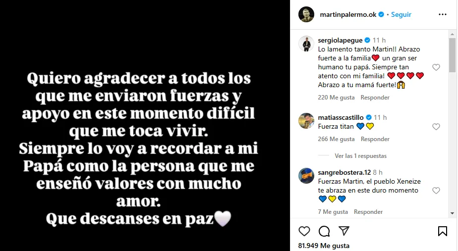 “Quiero agradecer a todos los que me enviaron fuerzas y apoyo en este momento difícil que me toca vivir“, escribió el Titán en su cuenta de Instagram. “Siempre lo voy a recordar a mi papá como la persona que me enseñó valores con mucho amor. Que descanses en paz“, cerró Martín.