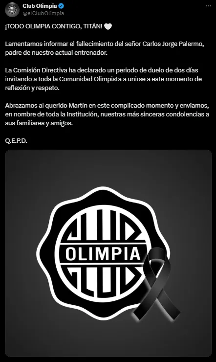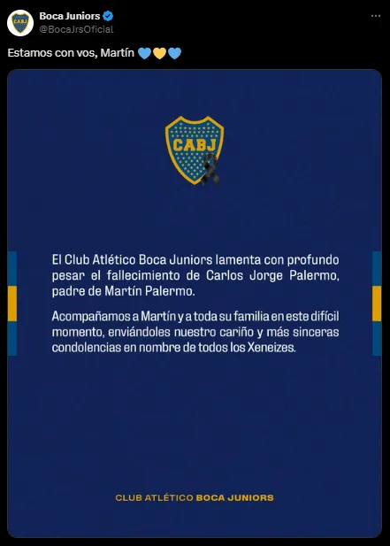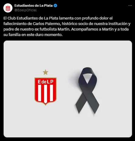 Las cuentas oficiales de Boca y Estudiantes de La Plata también le habían dedicado mensajes a Palermo lamentando la dolorosa partida de su padre. “Estamos con vos, Martín“, publicó en X (Twitter) el Xeneize junto a un comunicado enviando todo el cariño para el máximo goleador histórico de la institución.