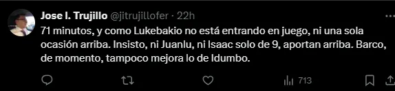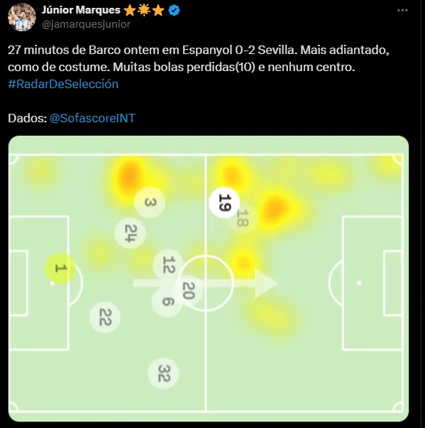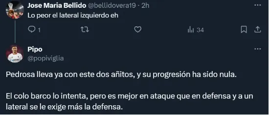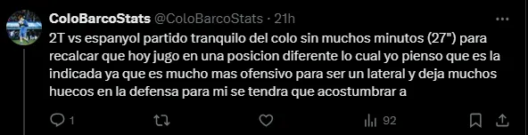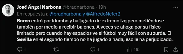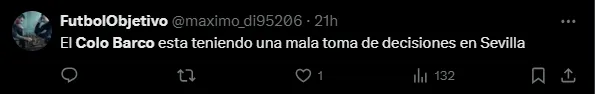 “El Colo Barco está teniendo una mala toma de decisiones en Sevilla“, fue uno de los comentarios de un usuario de X (Twitter). En ese sentido, otro hincha hizo énfasis en que debe mejorar su labor defensiva: “Lo intenta, pero es mejor en ataque que en defensa y a un lateral se le exige más“. Todas estas críticas dejan en evidencia que no hizo un buen partido y se lo hicieron saber.
