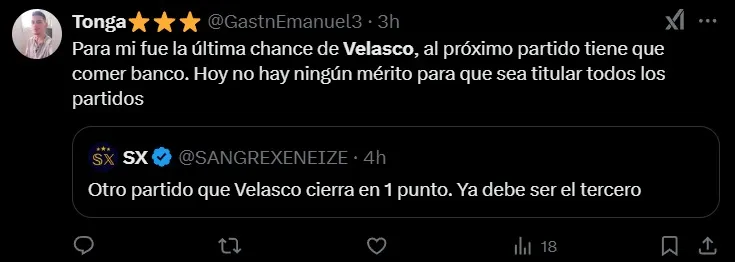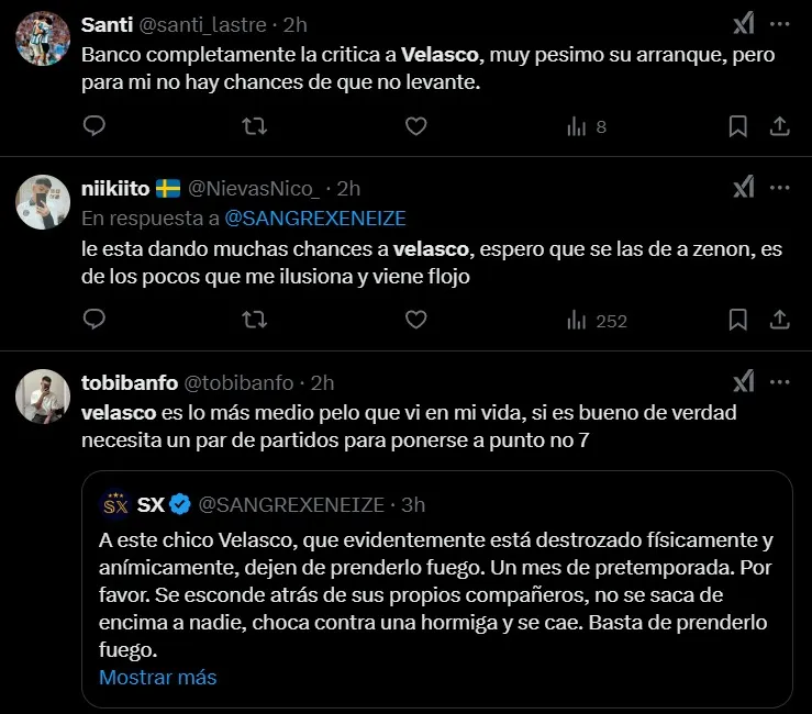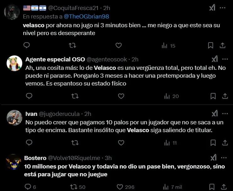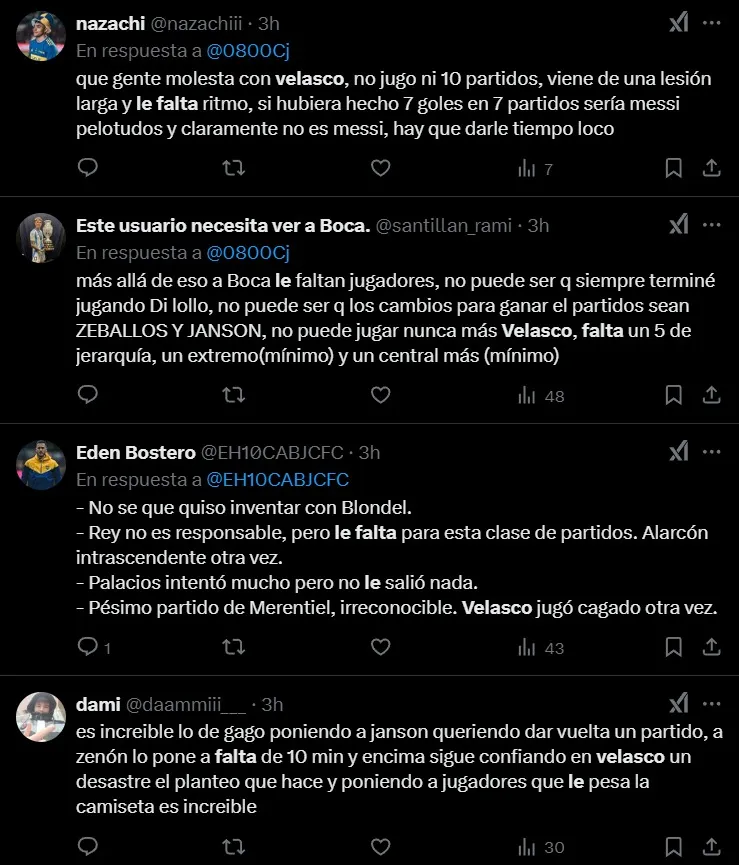 En la red social de X (Twitter) los fanáticos de Boca demostraron su enojo por la caída con Alianza Lima y les preocupa mucho el desempeño actual de Velasco. “Por ahora, no jugó ni 3 minutos bien… Me niego a creer que este sea su nivel, pero es desesperante“, dijo un usuario.