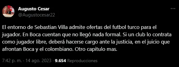 En este contexto, el periodista Augusto César dio un detalle que cambia el tono de la historia: “El entorno de Sebastián Villa admite ofertas del futbol turco para el jugador. En Boca cuentan que no llegó nada formal. Si un club lo contrata como jugador libre, deberá hacerse cargo ante la justicia, en el juicio que afrontan Boca y el colombiano. Otro capitulo más”. ¿Habrá problemas a partir de un nuevo contrato de Villa con otro club?