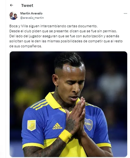Ahora, siguen intercambiando cartas de manera legal. Así lo aseguró el periodista Martín Arévalo: “Boca y Sebastián Villa siguen intercambiando cartas de documento. Desde el club piden que se presente: dicen que se fue sin permiso“, comenzó contando el cronista.