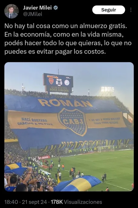 El Presidente de la Nación, quien confesó ser hincha del Xeneize, utilizó su cuenta personal de “X” (Twitter) y criticó duramente al mandamás del club. “No hay tal cosa como un almuerzo gratis. En la economía, como en la vida misma, podés hacer todo lo que quieras, lo que no puedes es evitar pagar los costos“, escribió Milei.