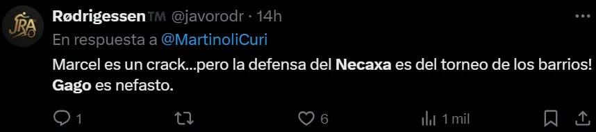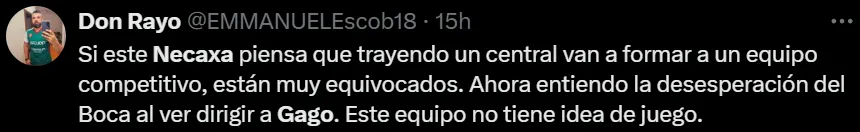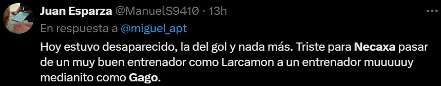La derrota devino en una oleada de cuestionamientos al entrenador argentino por parte de los hinchas mexicanos. “En qué pensaba el dueño del Necaxa cuando contrató a este payaso triste”, “Triste para Necaxa pasar de un muy buen entrenador como Larcamón a un entrenador muy medianito como Gago”, “Ojalá Gago se vaya pronto del Necaxa”, fueron algunos de los comentarios que los hinchas hicieron sobre el rendimiento del equipo.