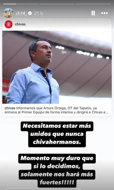El futbolista mexicano fue por más y luego de que el club anunciara a Arturo Ortega como el técnico interino, le envió un mensaje a sus hinchas: “Necesitamos estar más unidos que nunca, Chivahermanos. Momento duro que si lo decidimos, solamente nos hará más fuertes”, escribió Hernández.