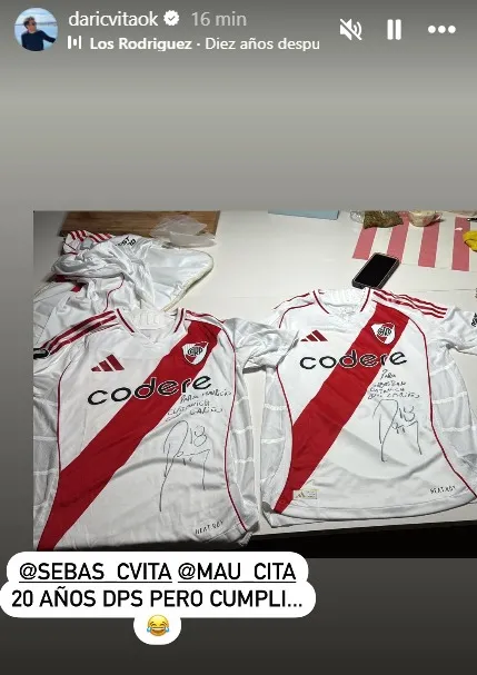 En su cuenta de Instagram, el ex atacante le agradeció al volante del equipo de Núñez por la foto que se sacaron y, además, mostró en otra historia dos camisetas de River firmadas, con dedicación a los hermanos del ex futbolista.