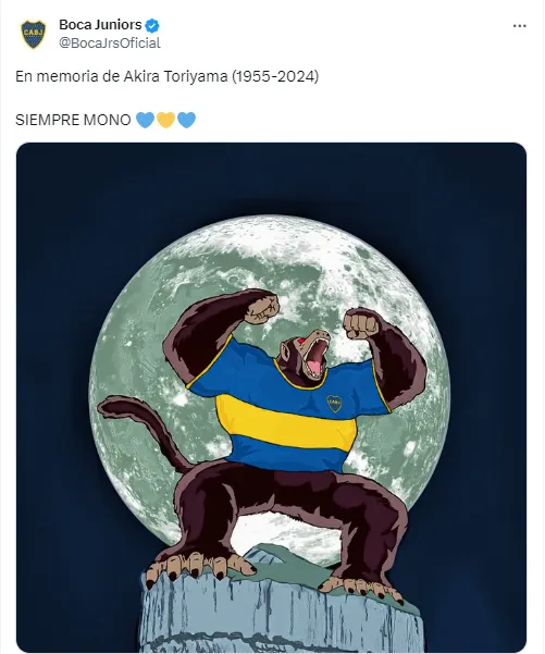 Boca hizo un edit de Goku, su protagonista principal, cuando se transformó en un mono gigante. Y le puso la camiseta del Xeneize: “En memoria de Akira Toriyama (1955-2024). SIEMPRE MONO”.