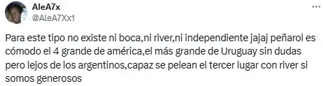 Por supuesto que muchos nombraron a Boca en su lista y también mencionaron a Independiente, River, Nacional o San Pablo por encima del conjunto aurinegro. En “X” (Twitter), aparecieron unos cuantos comentarios e incluso algunos hinchas del Xeneize ubicaron al “Manya” por encima del “Millonario”. “Más grande que River pero que Boca no” o “Todo bien con Peñarol pero no es más que Boca“, fueron algunas de las respuestas.