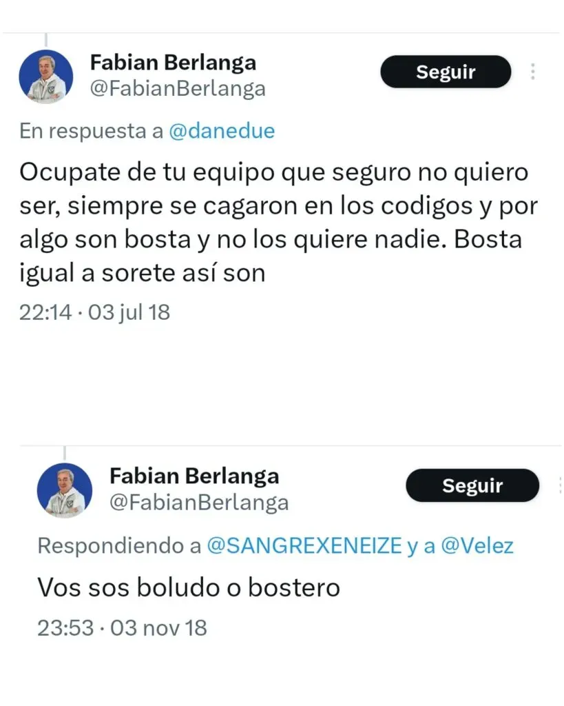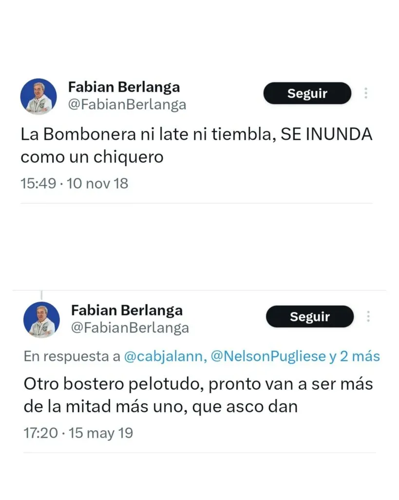 Y es que, a través de tuits viejos en su cuenta oficial, el dirigente dejó en claro su no simpatía por el cuadro de la Ribera: “La Bombonera no tiembla, ni late. Se inunda“, y “Por algo son bosta y no los quiere nadie. Bosta igual a sorete. Así son“.