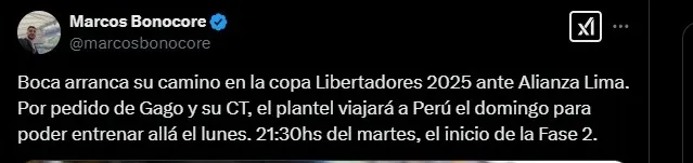 Según reveló el periodista Marcos Bonocore en “X”, el primer pedido de Gago para la dirigencia de Boca al enterarse que jugará ante Alianza Lima fue el de viaje este domingo 16 de febrero a Lima. ¿El motivo? Poder entrenar en Perú el día antes del partido del martes 18 de febrero.