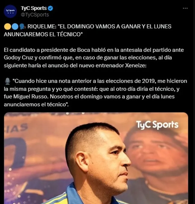 No obstante, hace tan solo horas, fue el mismo Juan Román Riquelme quien se refirió a la elección del próximo entrenador de Boca y fue cauto sobre el tema. A partir de esto, confesó que anunciará al nuevo técnico una vez que gane las elecciones presidenciales.