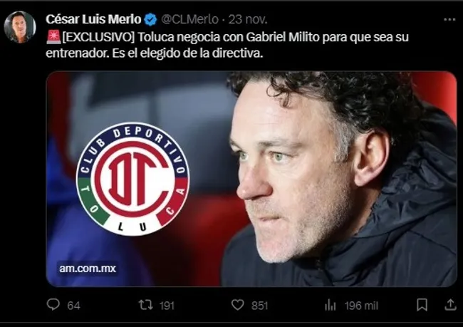 A su vez, el entrenador argentino también es pretendido por el Toluca de México, club que ya habría mantenido conversaciones con Milito según pudo citar César Luis Merlo en las pasadas horas.