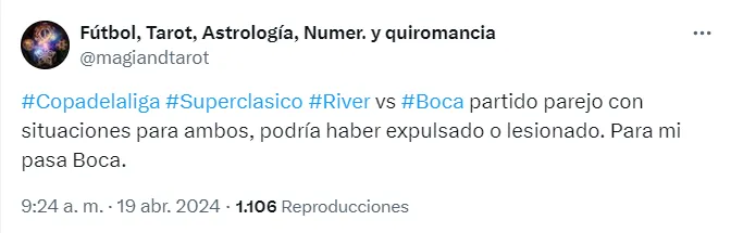 La cuenta @magiandtarot fue más contundente respecto al trámite del clásico: “Partido parejo con situaciones para ambos. Puede haber un lesionado o un expulsado. Para mi, pasa Boca”.