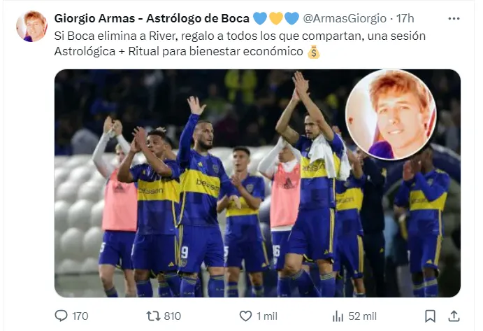Giorgio Armas, viral durante la última Copa Libertadores de América, volvió a jugar fuerte y dijo: “Si Boca elimina a River, regalo a todos los que compartan este posteo una sesión astrológica + ritual para bienestar económico”.