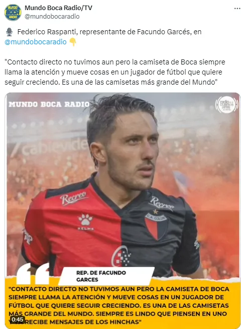 Así lo aseguró su representante Federico Raspanti, en diálogo con Mundo Boca Radio: “Contacto directo no tuvimos aún, pero la camiseta de Boca siempre llama la atención y mueve cosas en un jugador de fútbol que quiere seguir creciendo”.