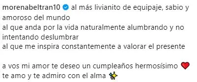 “Al que me inspira constantemente a valorar el presente. Te deseo un cumpleaños hermosísimo, te amo y te admiro con el alma”, continuó Morena junto a varios emojis de corazón y estrellas. Aunque no fue el único posteo. Tiempo después, subió a sus historias de Instagram el momento en el que le cantaban el feliz cumpleaños al jugador del Xeneize. “Los 28 del Sonri”, publicó su pareja.