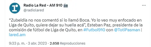 Esteban Paz, presidente de la Comisión de Fútbol de LDU, habló con Radio La Red sobre la situación del entrenador. “Llegó el año pasado, a mitad de año, me enfoqué en incorporarlo nuevamente. Lo conocía del paso 2014/2015 en la Liga. Además de ser un amigo, es un tremendo técnico. Lo convencimos de un proyecto deportivo. Este año le dimos rienda completa para armar el equipo a su gusto. Confío en que está muy enfocado en su trabajo”, comenzó.