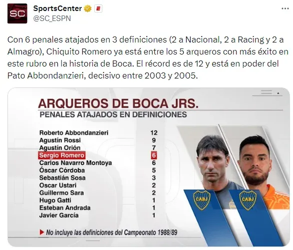 Uno de los primeros datos que se dio a conocer es la cantidad de penales atajados desde su arribo al cuadro de la Ribera. Puntualizando en este aspecto, 6 de ellos fueron en definiciones desde los doce pasos y lo coloca entre los cinco mejores guardametas de la institución con más efectividad.
