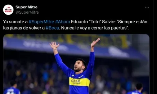 En lo que fue una entrevista con Radio Mitre, El Toto Salvio no dudó en mencionar a Boca y remarcó sus ganas de volver al Xeneize: “Siempre están las ganas de volver. Nunca le voy a cerrar las puertas. Haber jugado en Boca fue una de las mejores cosas de mi vida. El recuerdo es único“.
