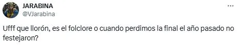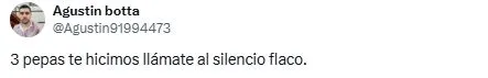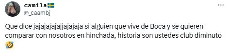 Los fanáticos del cuadro de la Ribera llenaron de comentarios este tuit y se subieron a las gastadas con todo tipo de respuestas. “Estos eran ustedes el año pasado, buenas noches Guido”, indicó un usuario en referencia a la victoria de Fluminense en Copa Libertadores. Mientras que otros comentaron “Es un chiste” o “3 pepas te hicimos llamate al silencio flaco”, en referencia al Superclásico que se dio en Córdoba.