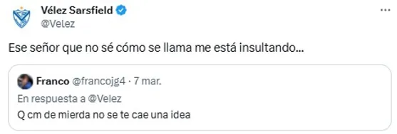 Y como sucede en cada una de las incorporaciones, el club lo anuncia con una serie de posteos en redes sociales. Previo a su bienvenida, apareció una publicación que no tardó en ser viral. En este caso, la cuenta del ‘Fortín’ le respondió a un hincha en “X” y utilizó una recordada frase de su DT: “Ese señor que no sé cómo se llama me está insultando…”