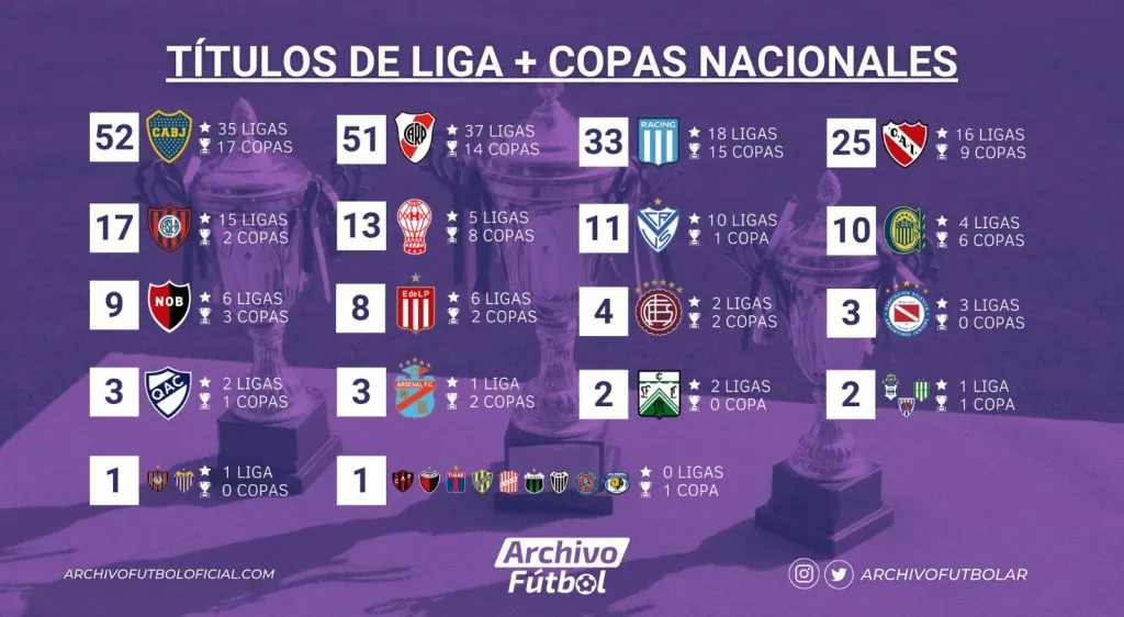 Con 35 ligas y 17 copas, el Único Grande vuelve a superar a su acérrimo rival y con estos grandes números, estira la diferencia con otros clubes de los denominados grandes como Racing con 33 títulos, Independiente con 25 y San Lorenzo con 17.