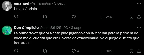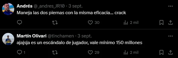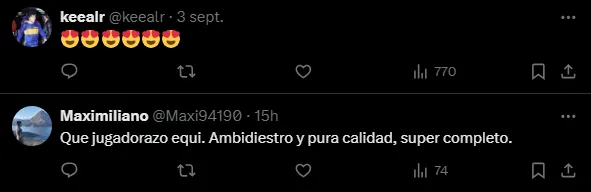 Y es que las imágenes mostraban highlights del propio Equi en ese cotejo. “Tu nuevo 6 favorito“, era el mensaje en la publicación junto a grandes cortes y pases del mediocampista de 23 años. Rápidamente, los simpatizantes de Boca inundaron de comentarios el posteo para elogiarlo. “Un escándalo“, “Disfrútenlo y cuídenlo” y “El mejor 5″ fueron algunos de los tuits.