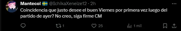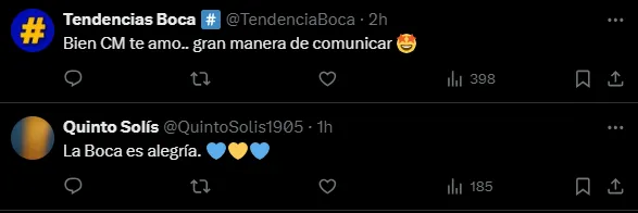 “¿Coincidencia que justo desee el buen Viernes por primera vez luego del partido de ayer? No creo, siga firme CM“, fue la respuesta de un hincha de Boca a modo de broma al posteo en cuestión. Otra fanática fue más explícita y marcó: “Cuando vos ganas y el enemigo pierde, la vida es hermosa“.
