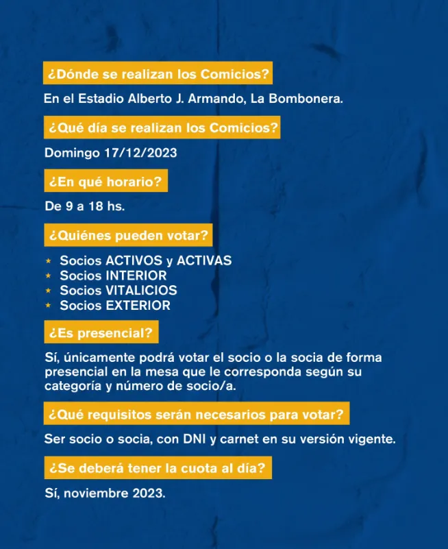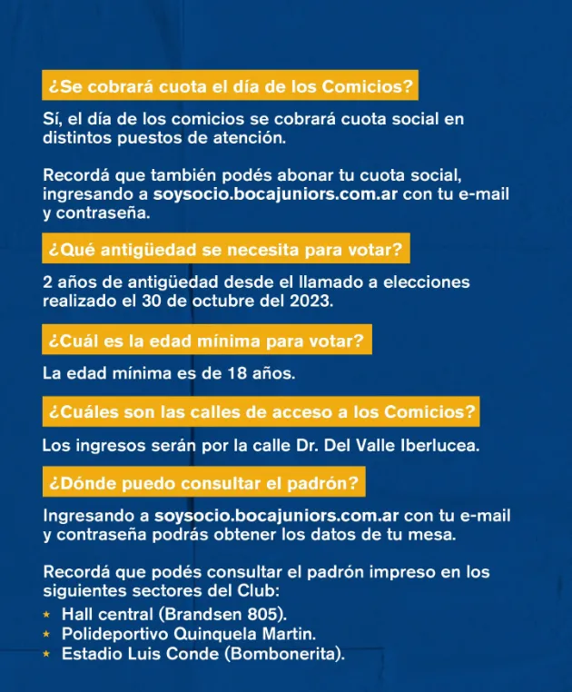Las elecciones en Boca tienen que ser una fiesta. Este domingo 17 de diciembre, desde las 9 de la mañana, más de 90mil socios activos estarán habilitados para ejercer su derecho al voto en campo de juego de La Bombonera. Por eso, el Xeneize se encargó de hacer una serie de aclaraciones a través de la cuenta oficial del club.