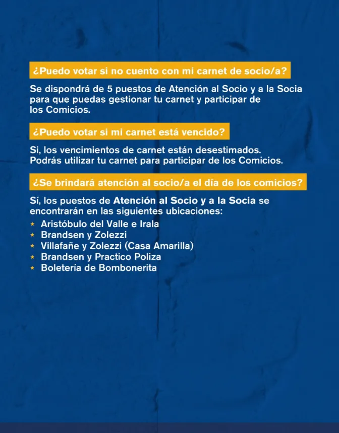 Boca dispondrá de 5 puestos de Atención al Socio para que puedan gestionar su carnet y participar de los comicios. Los mismos estarán ubicados en Aristóbulo del Valle e Irala; Brandsen y Zolezzi; Villafañe y Zolezzi (Casa Amarilla); Brandsen y Patricio Pilza y en la Boletería de La Bombonerita.