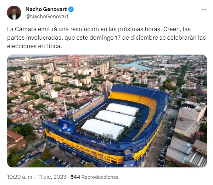 “Creen, las partes involucradas, que este domingo 17 de diciembre se celebrarán las elecciones en Boca”, escribió en su cuenta de X.