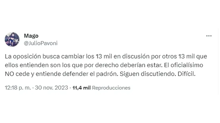 Según contó el periodista Julio Pavoni, la oposición busca que se den de baja los más de 13 mil socios que, según Andrés Ibarra y Mauricio Macri, generan irregularidades en el padrón para agregar otros 13 mil que sí cumplan con los requisitos. El oficialismo rechazó el pedido. Siguen conversando.